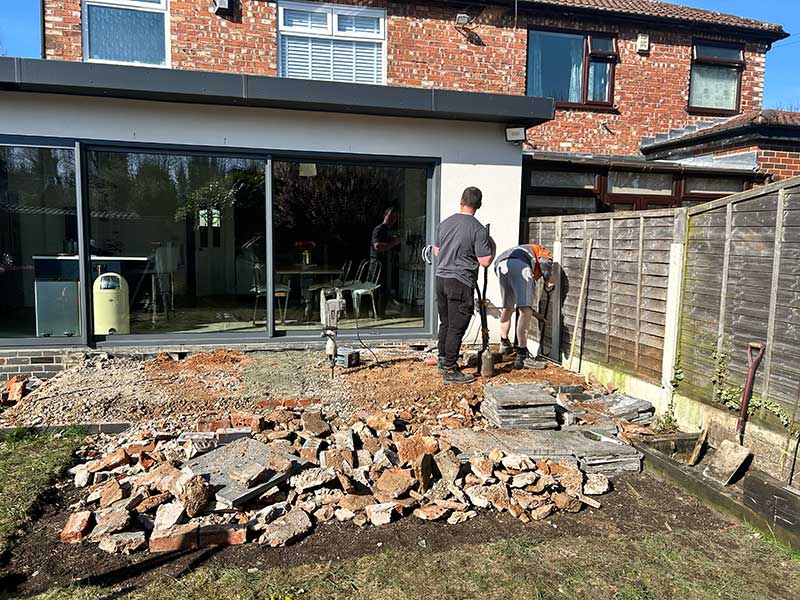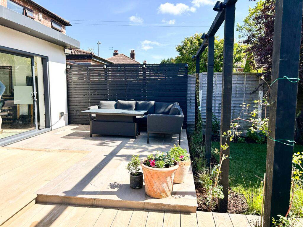 This mid-century semi-detached property in Eccles had a tired, uninspiring back garden that no longer met the needs of modern outdoor living. Working from a carefully considered layout, we transformed the space using a combination of natural stone paving and Millboard decking to create distinct zones for dining, relaxation and year-round enjoyment. Premium fencing provided privacy and structure, while new planting beds and lawn areas brought softness and greenery to balance the contemporary materials.